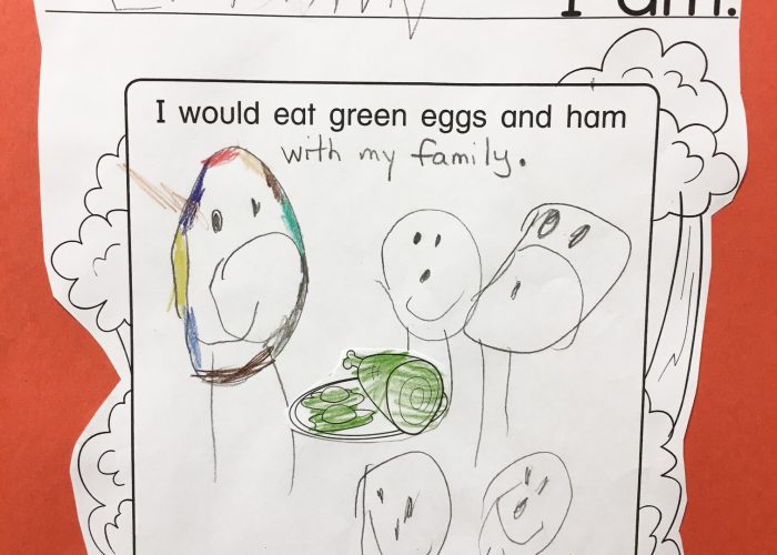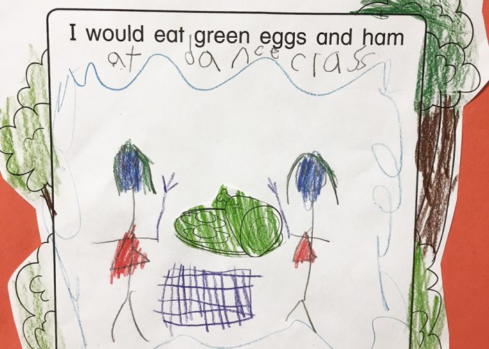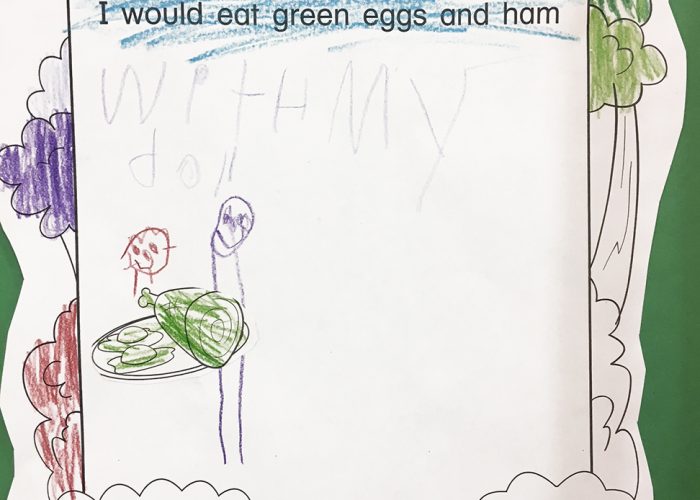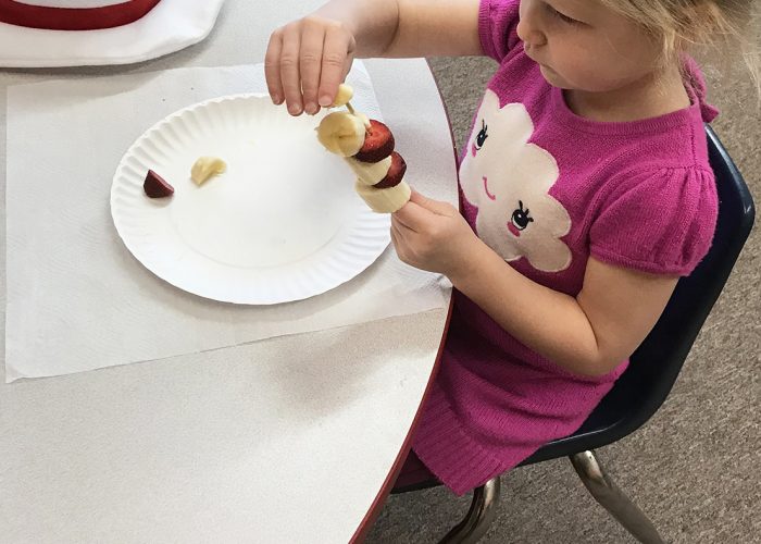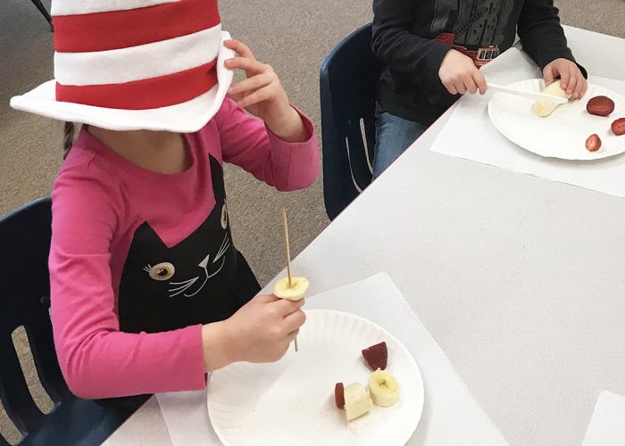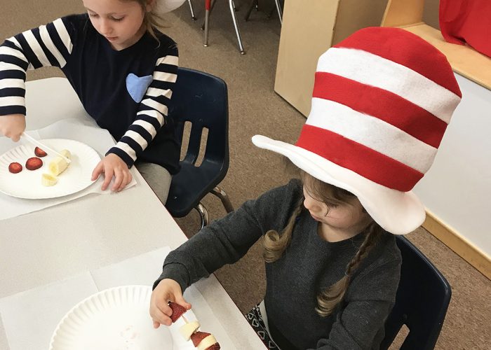 The students in Ms. Kennedy’s preschool class enjoyed making special “Cat In the Hat” treats for snack time. Stacking bananas and strawberries onto a skewer made for a fruity combination mirroring their fabulous hats! Where would you eat green eggs and ham?